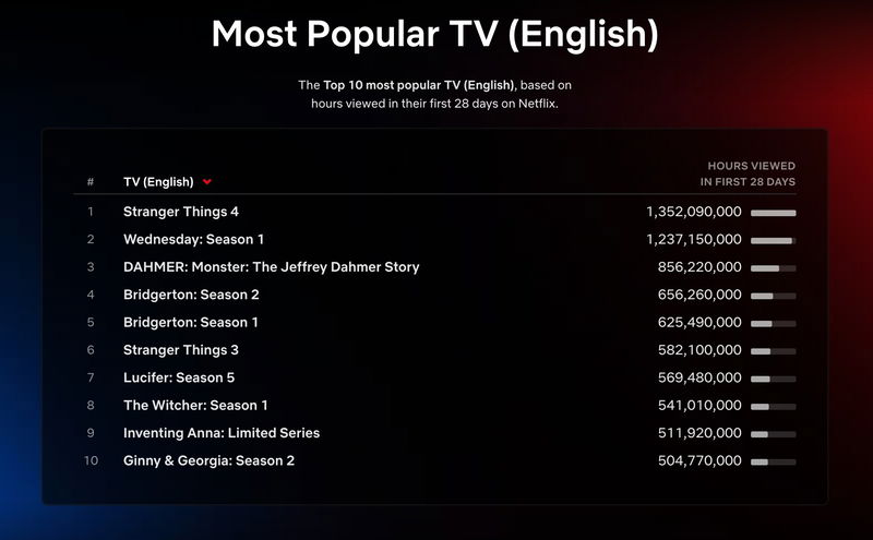 De best bekeken serie ooit op Netflix blijft nog altijd Stranger Things (2016– ) dankzij het wereldwijd megapopulaire vierde seizoen waar fans jaren op hebben gewacht. De serie staat zelfs nog een tweede keer in de lijst met seizoen 3. Andere megapopulaire series in de lijst zijn Wednesday (2022– ), Dahmer - Monster: The Jeffrey Dahmer Story (2022) en Bridgerton (2020– ).