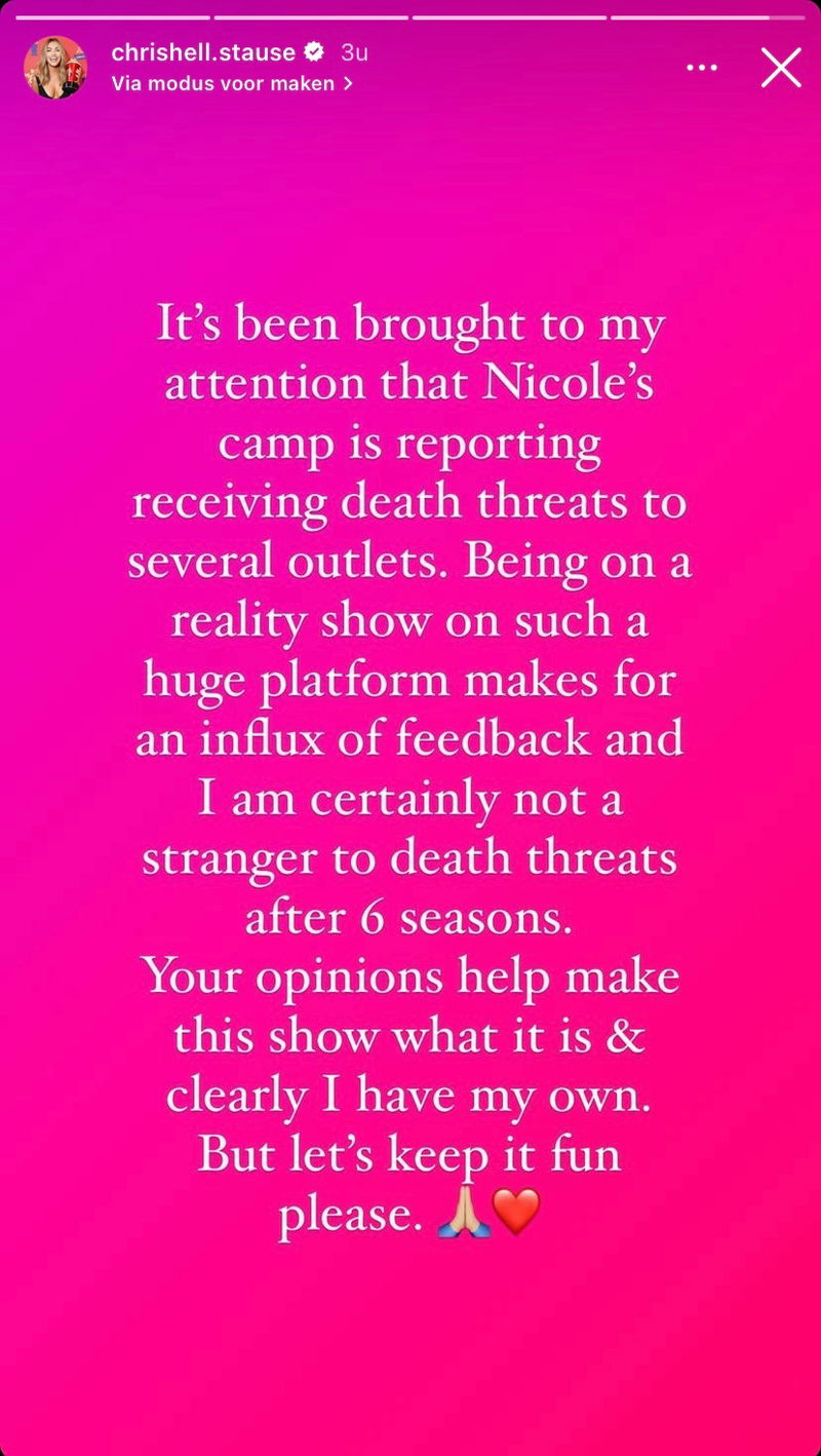 Op Instagram laat Chrishell in haar Story weten dat ze hier absoluut niet van gediend is. Ondanks dat zij gelijk beweert te hebben – en dit vervolgens probeert te bewijzen met screenshots van mailverkeer tussen haar en Nicole – keurt ze de doodsbedreigingen af en roept ze 'fans' op om hiermee te stoppen. "Laten we het gezellig houden," schrijft ze.