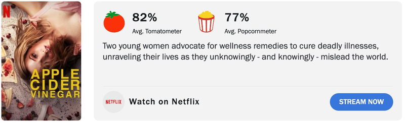 Critici belonen "Apple Cider Vinegar met een score van 82% op Rotten Tomatoes. Ook abonnees zijn met 77% erg enthousiast. "De serie is veel te goed!" klinkt het op sociale media. Inmiddels staat de Australische miniserie al op plek 7 in de Netflix top 10.